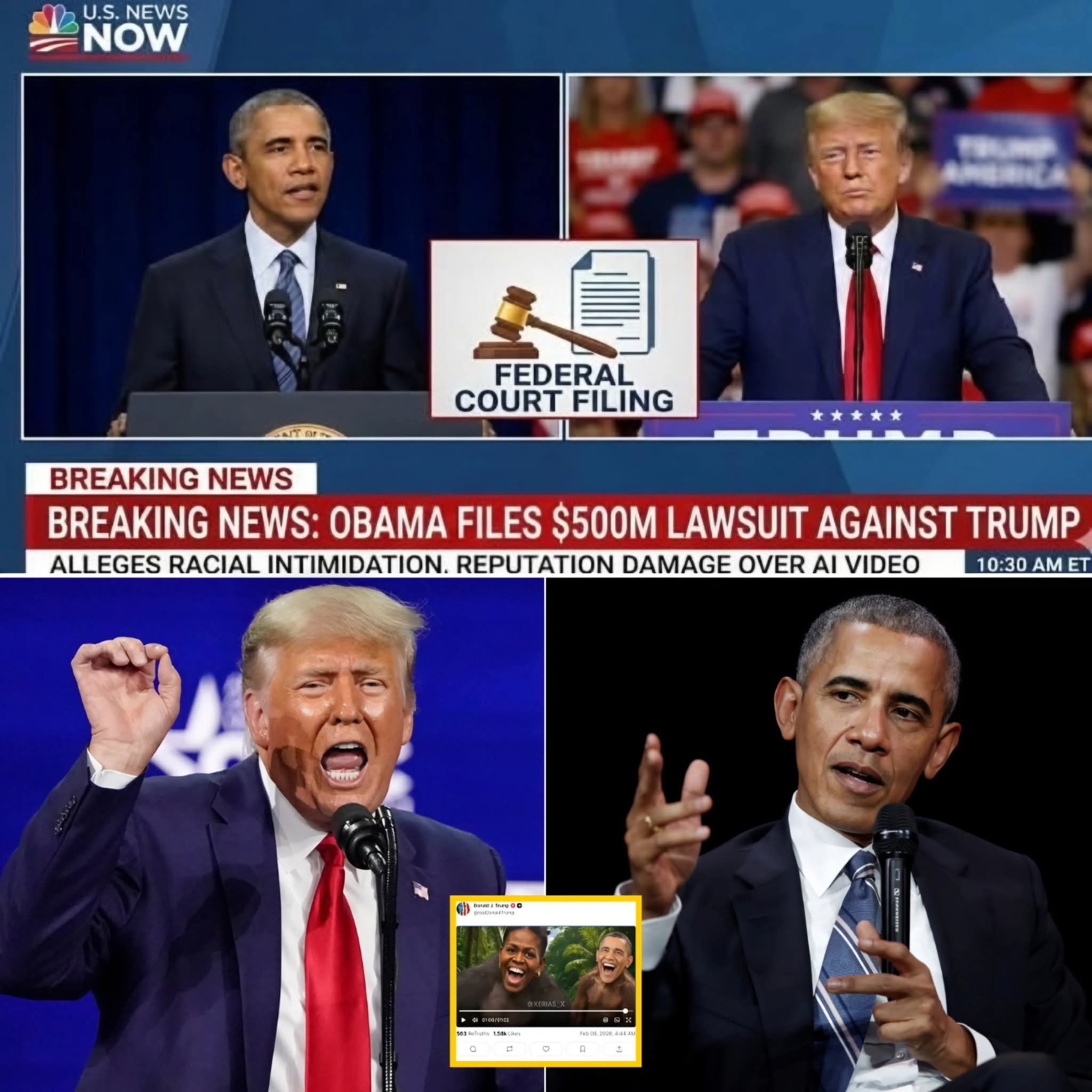 🚨 JUST IN: Former President Barack Obama Reportedly Files $500 Million Lawsuit Against Donald T̄RUMP, Alleging Racial Intimidation and Severe Reputation Damage After He Posted AI-Generated Video Depicting Barack & Michelle Obama as Monkeys — Shocking Legal Showdown! ⚡ In one breathtaking, explosive twist shaking the very core of this political saga, the staggering lawsuit filed from the corridors of justice is being described as completely redefining the defamation battlefield, unleashing furious reactions throughout Washington and thrusting the T̄RUMP administration dangerously close to a devastating reckoning. Analysts are labeling this racial bombshell a catastrophic trigger, speeding up the crumbling of defenses and igniting savage debates over AI manipulations, presidential provocations, and the total disintegration of the Oval Office’s untouchable aura. As commentary from experts pours in relentlessly and tension skyrockets to unbearable extremes, this lawsuit eruption has exploded into a scorching hotspot — a lethal danger that could rip apart vital political immunities and hurl the whole administration headfirst into an unparalleled whirlwind of accountability and constitutional fury.