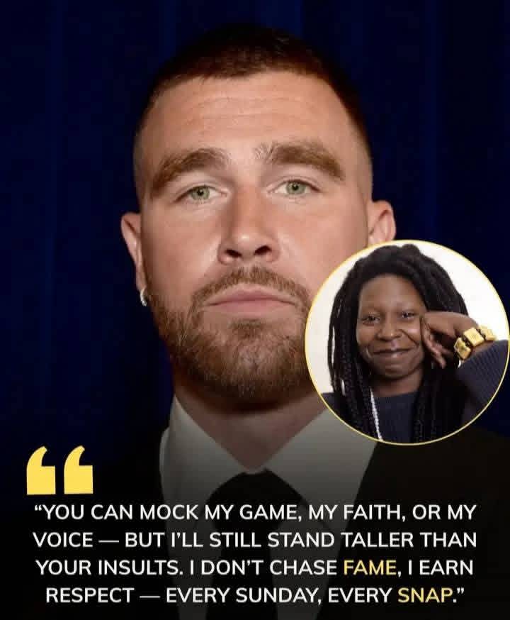 Breaking SHOCKING LIVE TV MOMENT FROM DALLAS: “HE’S JUST A FOOTBALL PLAYER.” Those five words from Whoopi Goldberg instantly backfired when Chiefs star Travis Kelce looked straight into the camera and dropped a line that stopped the entire studio cold. Within minutes, the clip exploded across social media — millions watching the exact moment Kelce turned a casual insult into a national wake-up call. What he said next didn’t just silence Whoopi — it sent shockwaves through the NFL, Hollywood, and every living room in America. READ MORE:⤵️⤵️