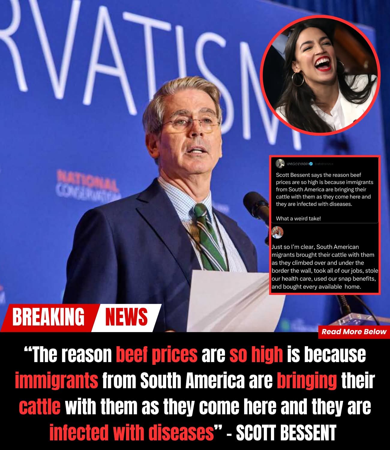 SCOTT BESSENT SAYS BEEF PRICES ARE UP BECAUSE SOUTH AMERICAN MIGRANTS… BROUGHT THEIR CATTLE ACROSS THE BORDER?! Twitter froze for three seconds and then exploded as two scholars hit back with America’s favorite weapon: BRUTAL SARCASM.“Right, they carried their cows over the wall, dug tunnels, stole every job, took all the healthcare, used all the benefits, and bought every house. Anything else?” 👉 This troll had the entire timeline laughing — click to see the full exchange..,.⤵️