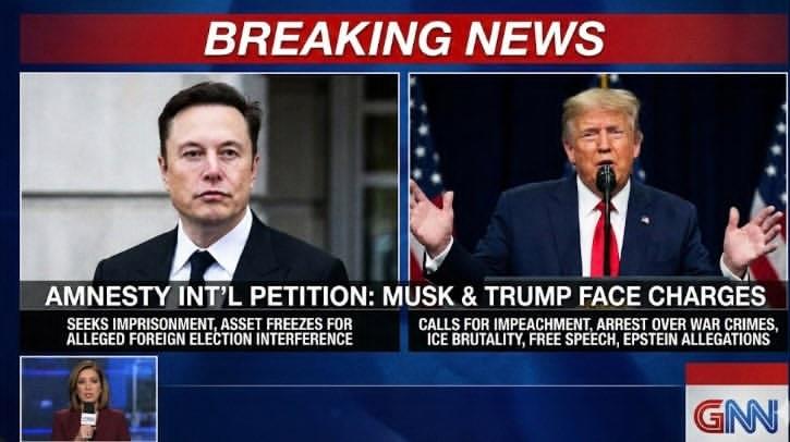 UPDATE: Amnesty International Submits Petition Seeking Possible Imprisonment and Asset Freezes for Elon Musk Over Alleged Foreign Election Interference, Also Calls for Donald Trump’s Impeachment and Arrest, Citing Allegations of War Crimes, ICE Brutality, Free Speech Abuse, and Epstein-Related Concern⤵️
